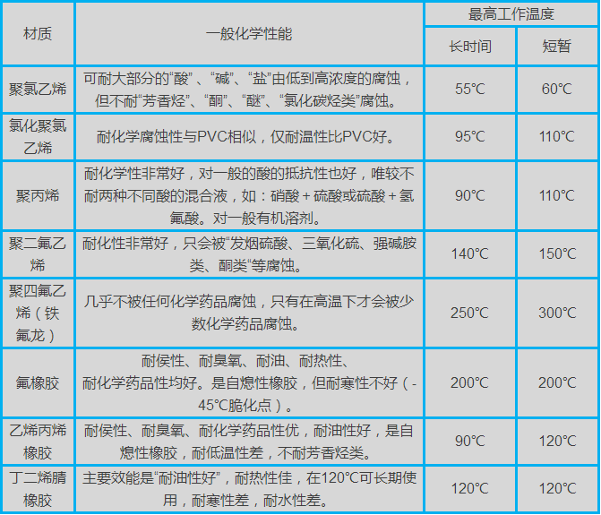 常用非金屬材料適用工況: