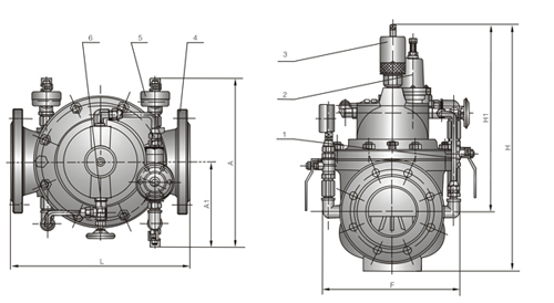 該閥由主閥4、針閥6、流量調(diào)節(jié)閥3、導(dǎo)閥2、球閥1與壓力表5組成。流量控制閥設(shè)置在給水管線中?上仍O(shè)定調(diào)正閥門上部導(dǎo)閥2及流量調(diào)節(jié)閥3某一固定流量,就可使通過主閥的流量保持不變,即使主閥上游發(fā)生變化也不會(huì)對(duì)流量產(chǎn)生影響。